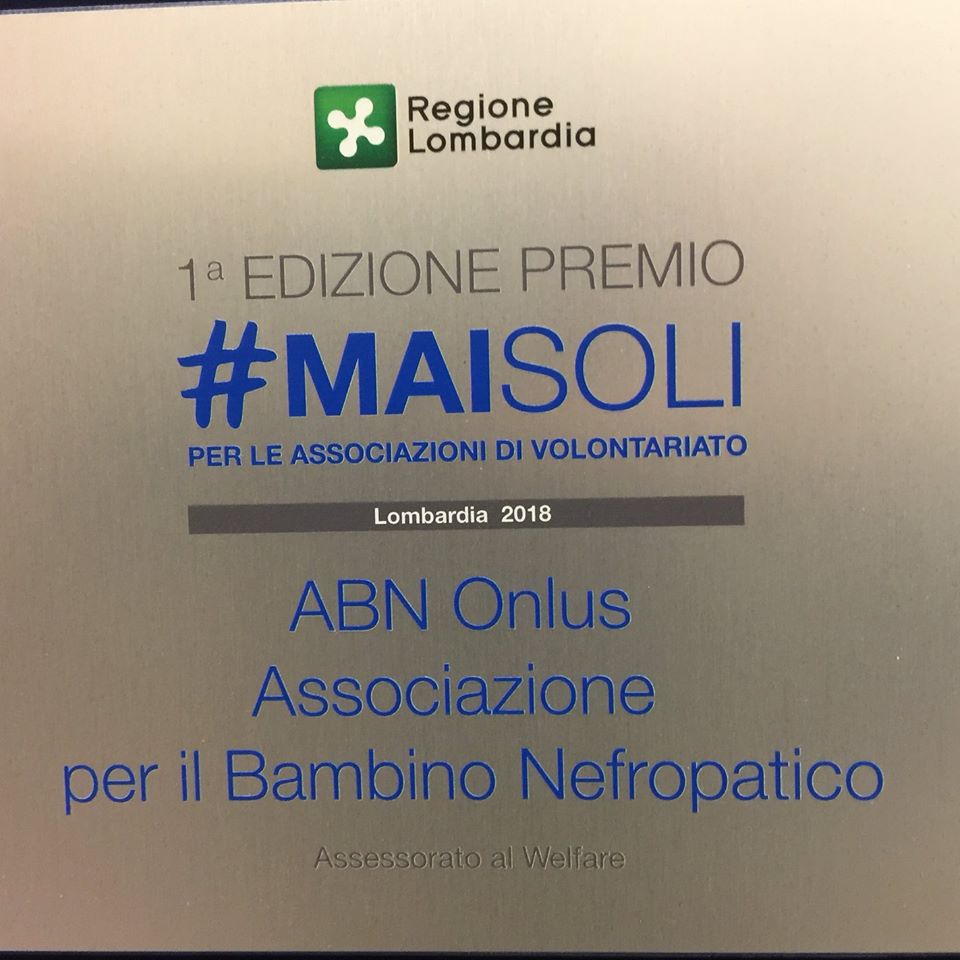 1° Edizione Premio "MAI SOLI" per le Associazioni di Volontariato della Regione Lombardia: l'Associazione per il Bambino Nefropatico - ABN Onlus č stata scelta all'interno del sistema sanitario e socio sanitario della Lombardia e premiata per essersi distinta con il suo operato nel corso del 2017.